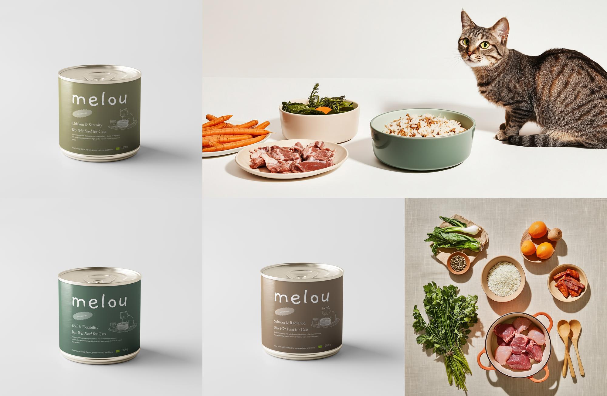 For the pet food brand Melou, I developed a warm and wholesome visual identity that reflects the brand’s natural, French-inspired values. The design combines soft colors, organic shapes, and charming typography to evoke a cozy, home-like feeling rooted in care and quality. I worked on the logo, packaging concepts, and brand visuals, ensuring consistency across all touchpoints. To support the concept development, I also used AI tools to generate product photos, custom illustrations, and text content that enhanced the overall storytelling. The result is a distinctive and emotionally engaging identity tailored to mindful pet owners.