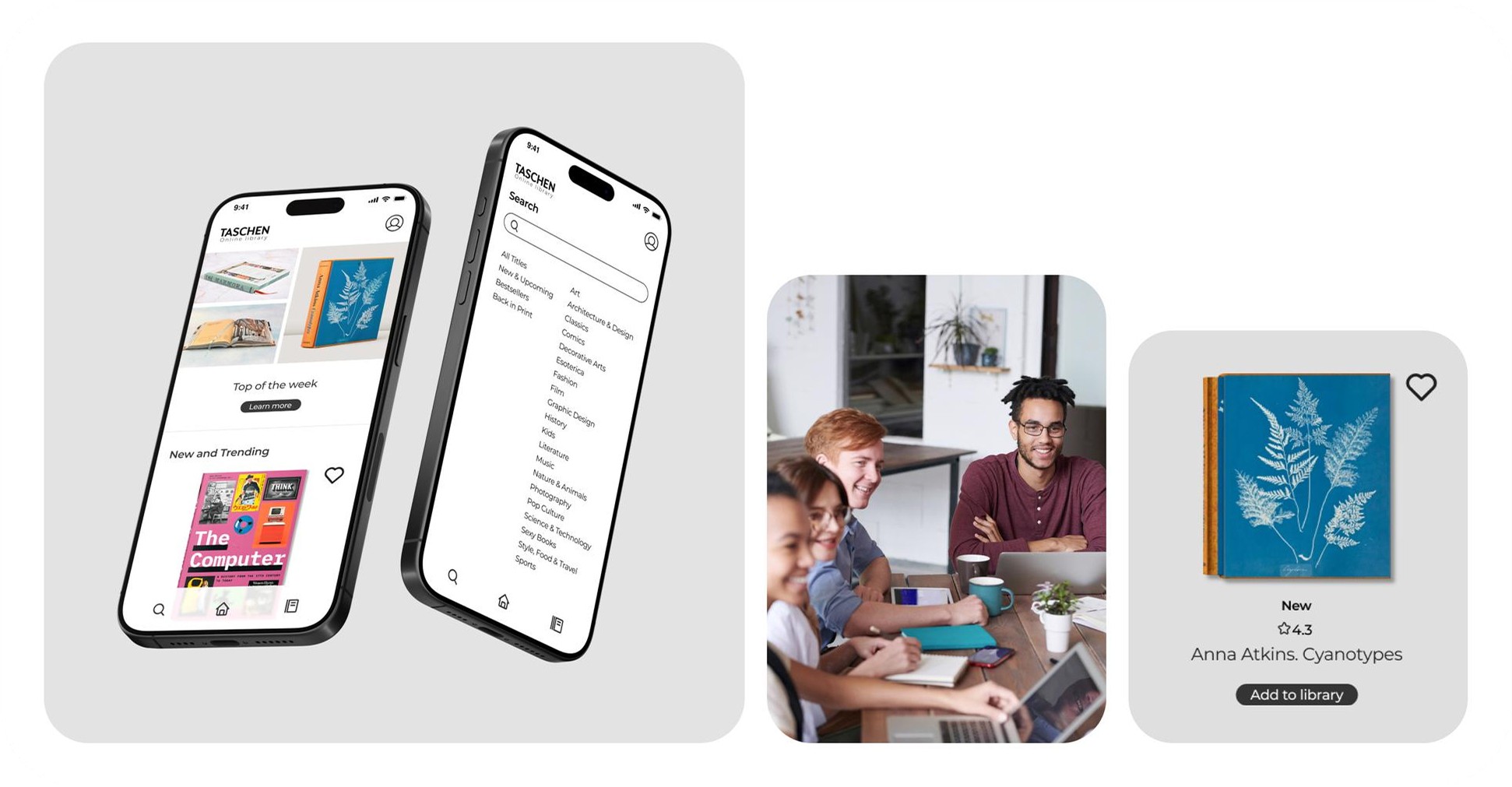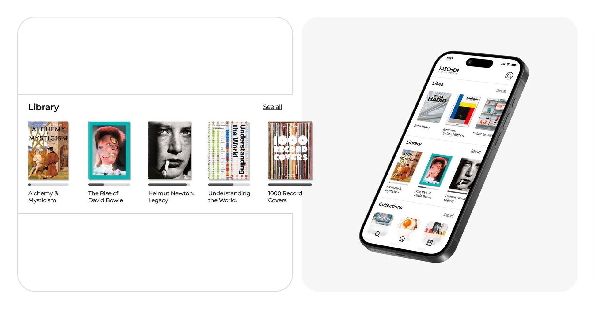 The UX concept was built around the idea of the personal library as a curated space rather than a content feed. Visual hierarchy, typography, and interaction patterns were chosen to slow the experience down — to invite browsing rather than scrolling. The result is an app that positions reading as intentional, with Taschen's editorial quality as the constant backdrop.